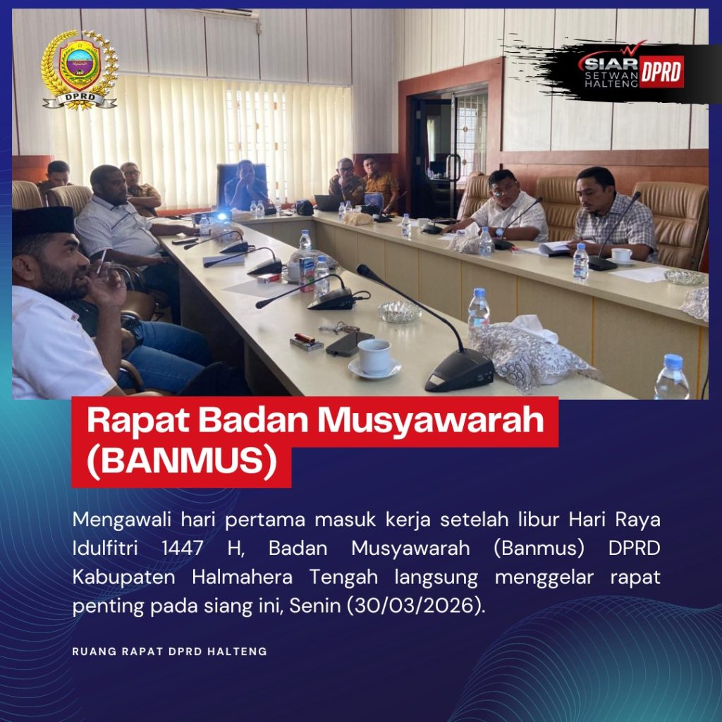 WEDA – Semangat pelayanan publik langsung ditunjukkan oleh jajaran legislatif Kabupaten Halmahera Tengah. Mengawali hari pertama kerja setelah libur panjang Hari Raya Idulfitri 1447 H, Badan Musyawarah (Banmus) DPRD Kabupaten Halmahera Tengah bergerak cepat dengan menggelar rapat koordinasi penting, Senin (30/03/2026).