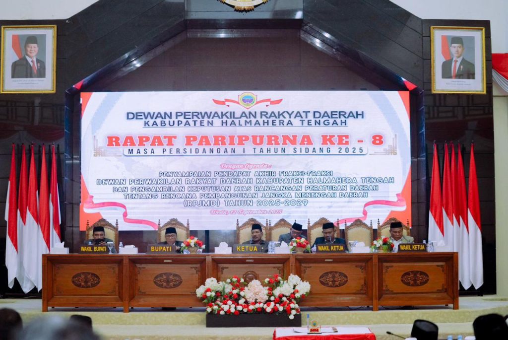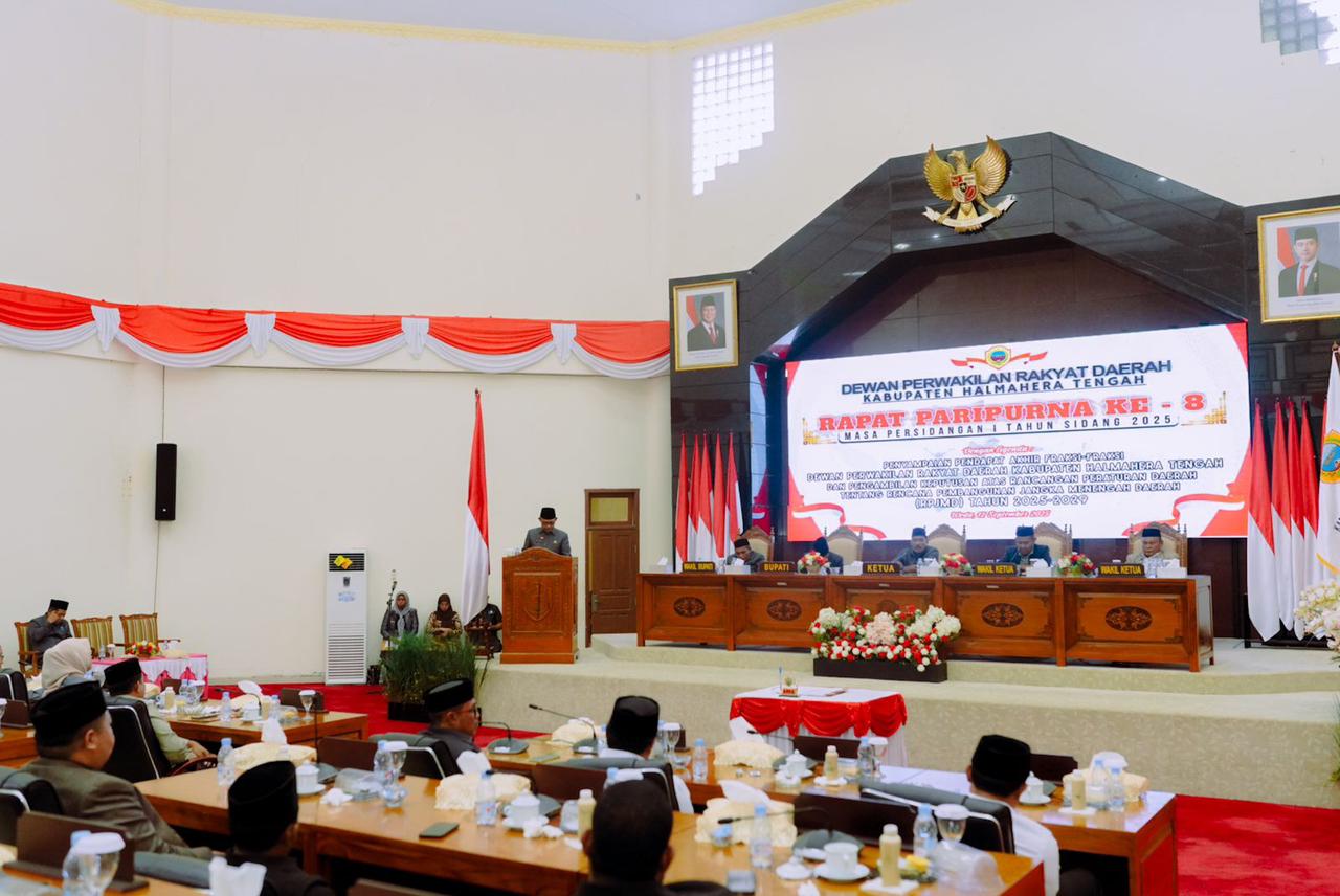 WEDA – Dewan Perwakilan Rakyat Daerah (DPRD) Kabupaten Halmahera Tengah menggelar Rapat Paripurna Ke-8 Masa Persidangan I Tahun Sidang 2025, Jumat (12/9/2025), bertempat di Ruang Sidang DPRD Halteng.