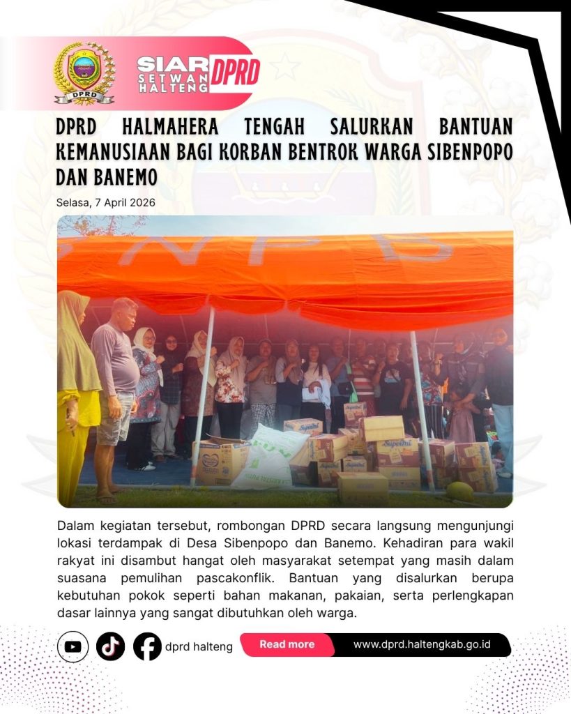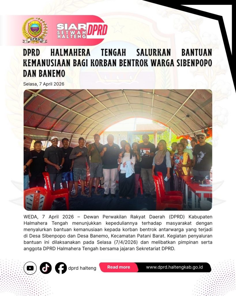 WEDA, 7 April 2026 – Dewan Perwakilan Rakyat Daerah (DPRD) Kabupaten Halmahera Tengah menunjukkan kepeduliannya terhadap masyarakat dengan menyalurkan bantuan kemanusiaan kepada korban bentrok antarwarga yang terjadi di Desa Sibenpopo dan Desa Banemo, Kecamatan Patani Barat. Kegiatan penyaluran bantuan ini dilaksanakan pada Selasa (7/4/2026) dan melibatkan pimpinan serta anggota DPRD Halmahera Tengah bersama jajaran Sekretariat DPRD.