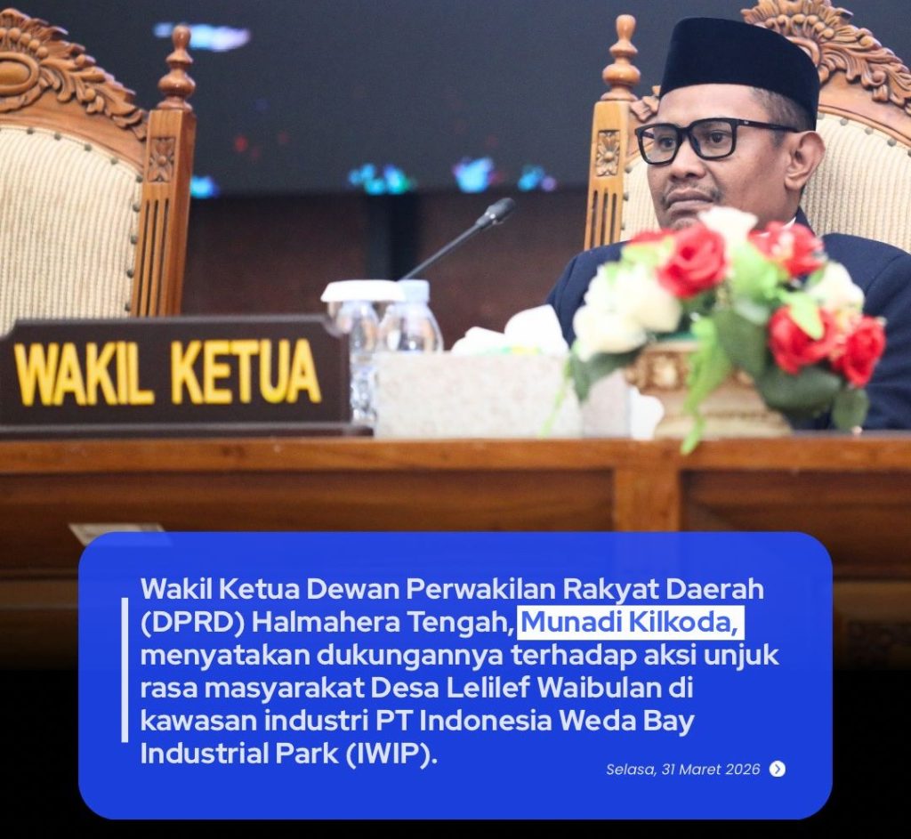 WEDA, 01 April 2026 – Wakil Ketua Dewan Perwakilan Rakyat Daerah (DPRD) Kabupaten Halmahera Tengah, Munadi Kilkoda, secara terbuka menyatakan dukungannya terhadap aksi unjuk rasa yang dilakukan oleh masyarakat Desa Lelilef Waibulan. Aksi tersebut berlangsung di kawasan industri PT Indonesia Weda Bay Industrial Park (IWIP) pada Senin (30/3).