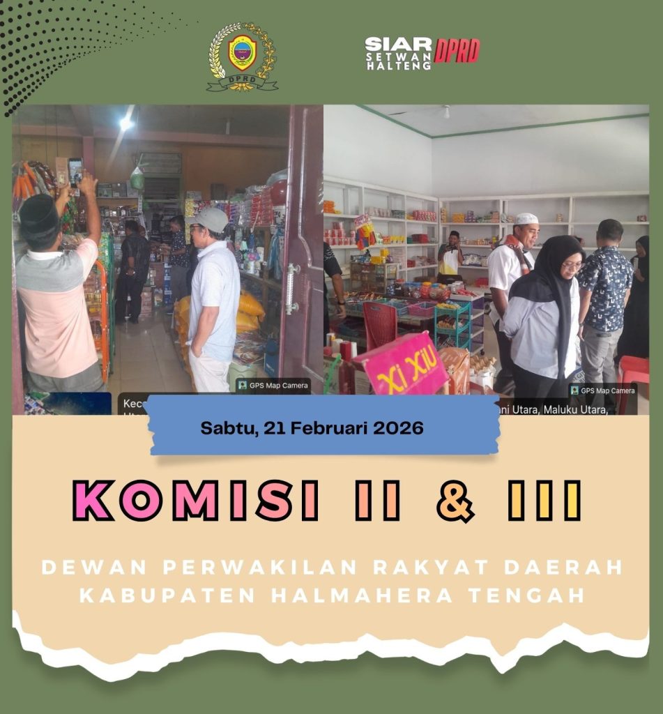 PATANI UTARA – Sabtu, 21/02/2026. Demi memastikan stabilitas harga dan ketersediaan stok bahan pangan di bulan suci Ramadhan 1447 H, Gabungan Komisi II dan III DPRD Kabupaten Halmahera Tengah melaksanakan Kunjungan Kerja Lapangan ke wilayah Kecamatan Patani Utara.