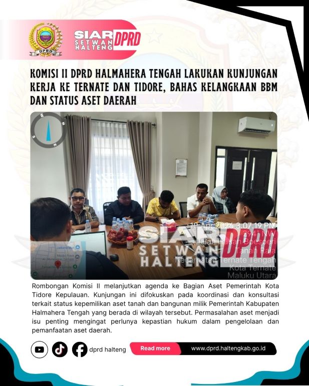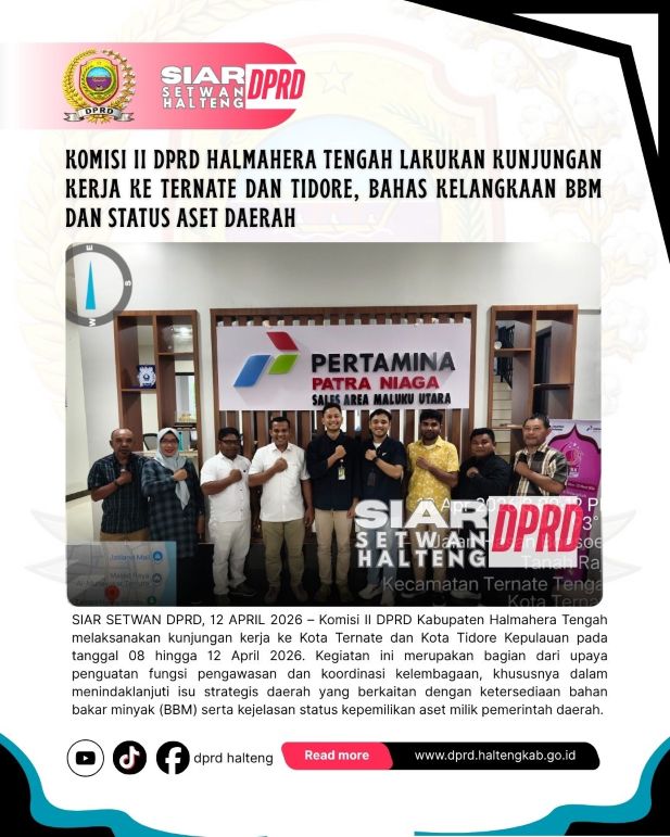 SIAR SETWAN DPRD, 12 APRIL 2026 – Komisi II DPRD Kabupaten Halmahera Tengah melaksanakan kunjungan kerja ke Kota Ternate dan Kota Tidore Kepulauan pada tanggal 08 hingga 12 April 2026. Kegiatan ini merupakan bagian dari upaya penguatan fungsi pengawasan dan koordinasi kelembagaan, khususnya dalam menindaklanjuti isu strategis daerah yang berkaitan dengan ketersediaan bahan bakar minyak (BBM) serta kejelasan status kepemilikan aset milik pemerintah daerah.