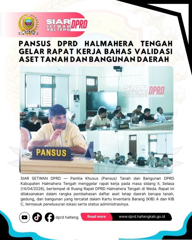 SIAR SETWAN DPRD — Panitia Khusus (Pansus) Tanah dan Bangunan DPRD Kabupaten Halmahera Tengah menggelar rapat kerja pada masa sidang II, Selasa (14/04/2026), bertempat di Ruang Rapat DPRD Halmahera Tengah di Weda. Rapat ini dilaksanakan dalam rangka pembahasan daftar aset tetap daerah berupa tanah, gedung, dan bangunan yang tercatat dalam Kartu Inventaris Barang (KIB) A dan KIB C, termasuk penelusuran lokasi serta status administrasinya.