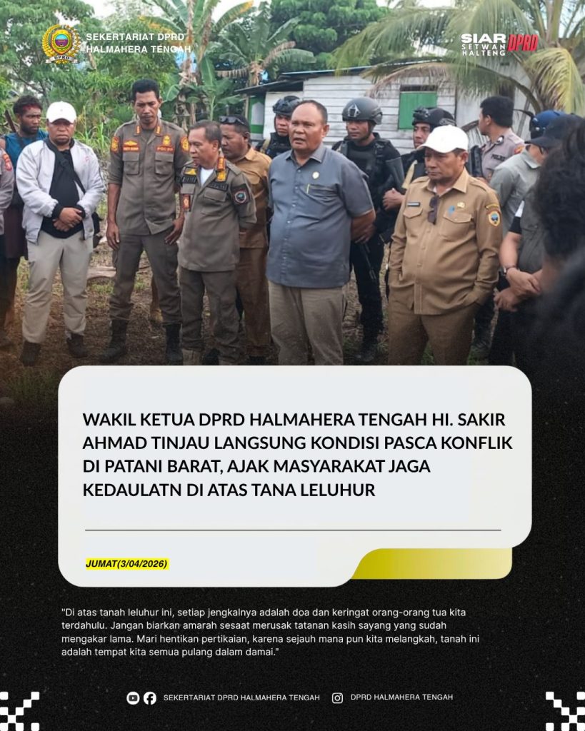 WEDA, 4 April 2026 – Wakil Ketua DPRD Kabupaten Halmahera Tengah, Hi. Sakir Ahmad bersama Bapak Bupati, Sekda Halamhera Tengah dan Forkompimda, melakukan kunjungan langsung ke wilayah Patani Barat, tepatnya di Desa Banemo dan Sibenpopo, pada Jumat (3/4/2026), guna melihat kondisi masyarakat pasca terjadinya konflik yang menimbulkan korban jiwa dan kerugian material.